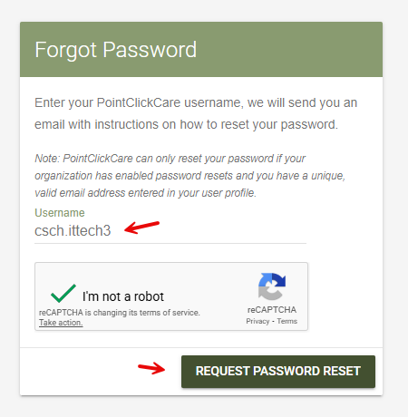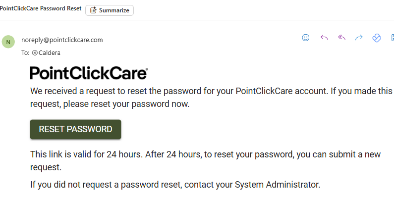 If you have an email address saved in your PointClickCare user profile, you’ll receive an email shortly with instructions to reset your password.